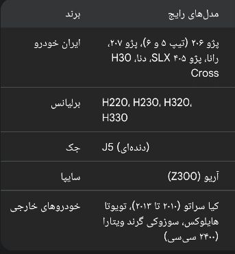 مناسب برای خودروپژو 206 تیپ 5 و 6 - پژو 207 - رانا - پژو 405 اس ال ایکس